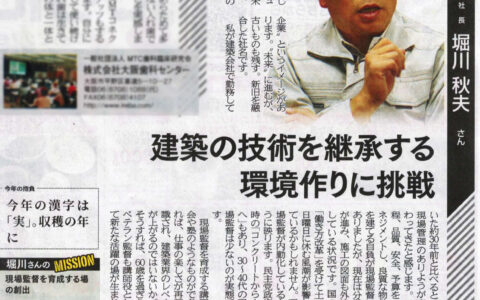 大阪日日新聞(2020.1.25)に掲載されました! 2020年01月25日 ニュース メディア掲載 掲載紙大阪日日新聞掲載日2020年1月25日 記事 建築の技術を継承する環境作りに挑戦 個人事業主から法人化した昨年5月、「ノーレギュラージョブ」の社名も「未来屋本舗」に改めました。”本舗”の響きには”昔の企業”というイメージがあります。”未来”に進むが、古いものも残す。新旧を融合した社名で... 詳しく見る